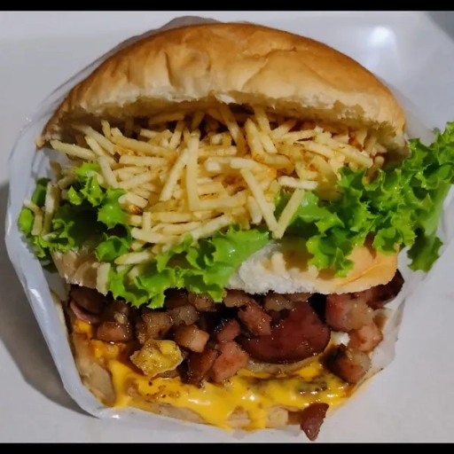 Bife da casa bovino 90g, bacon, presunto, mussarela, calabresa, frango desfiado, cheddar, alface, tomate, milho e batata... Ver completo