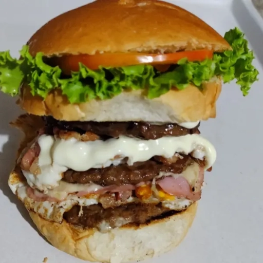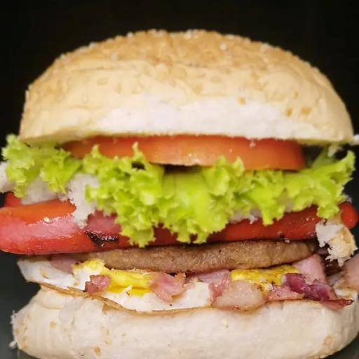 Dois Bifes da casa bovino 90g cada, dois ovos, calabresa, presunto, mussarela, catupiry, barbecue, picles, alface, tomat... Ver completo