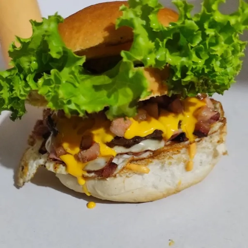 Bife da casa bovino, mussarela, cheddar, cebola caramelizada, ovo, bacon, picles, alface, tomate, milho e batata palha.