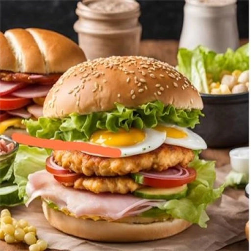 Bife de frango, molho baconese, ovo, cebola grelhada, presunto, mussarela, picles, alface, tomate, milho e batata palha.