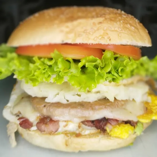 Dois Bifes da casa bovino 90g cada, dois ovos, calabresa, presunto, mussarela, catupiry, barbecue, picles, alface, tomat... Ver completo